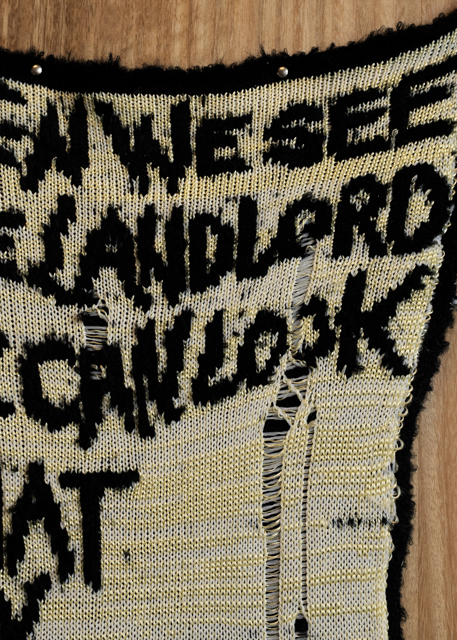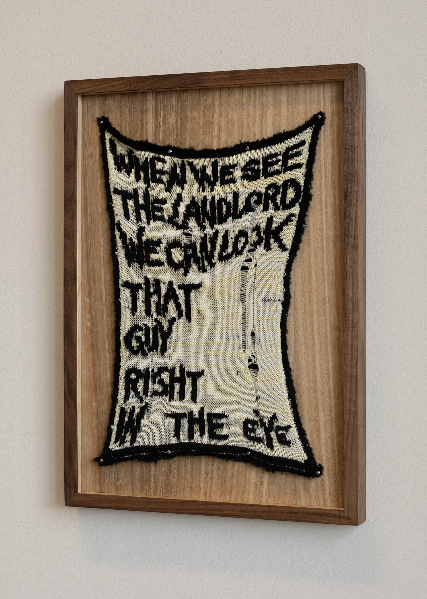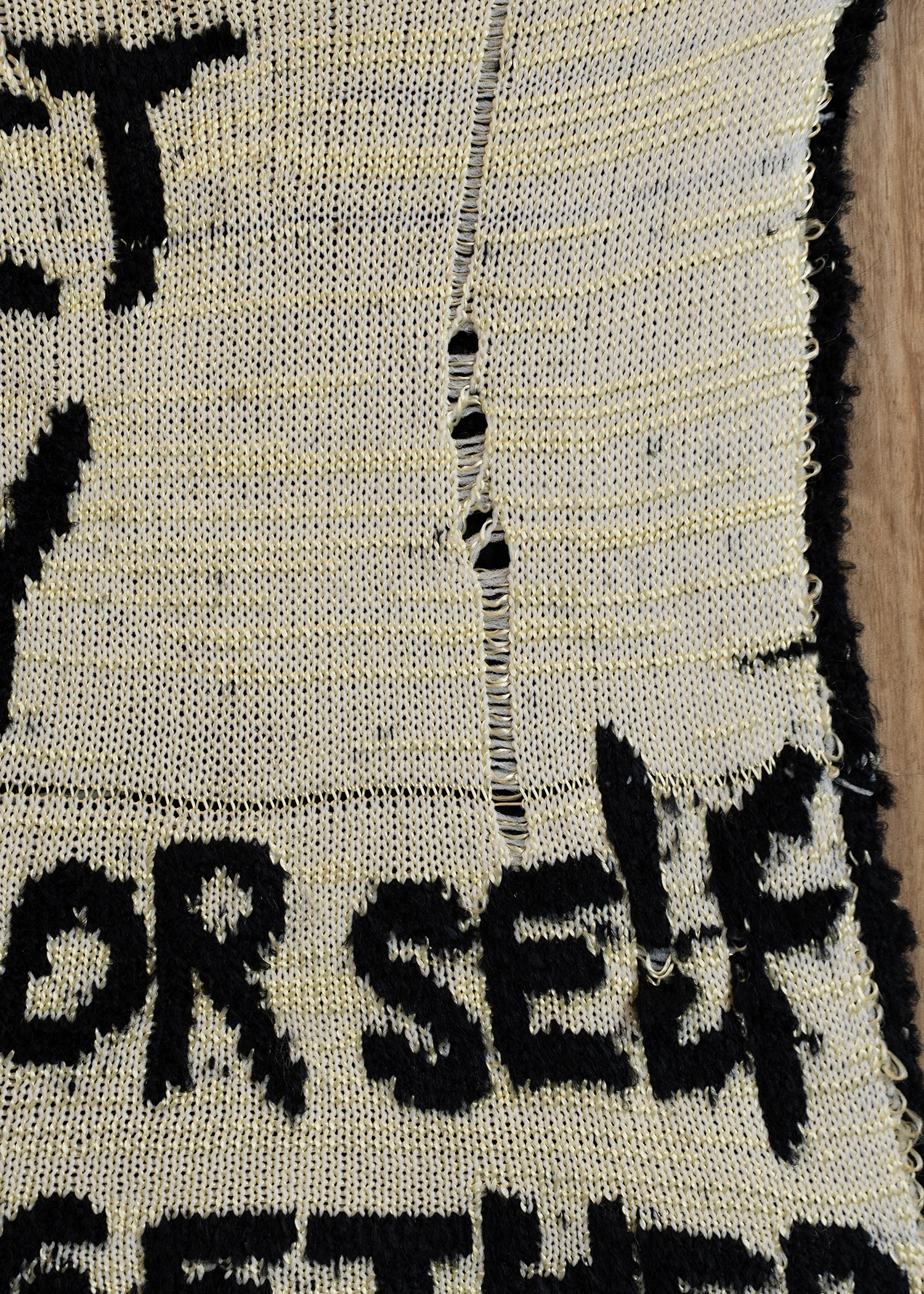- Knitted words — in some places they seem quite frayed — tell us that it makes no difference whether it’s sweet or hot, the poor self or about the encounter with the landlord. What reads like comments taken from everyday life are in fact lines from song lyrics that accompany the stock market news on a US radio show. The choice of song—whether it is “We’re in