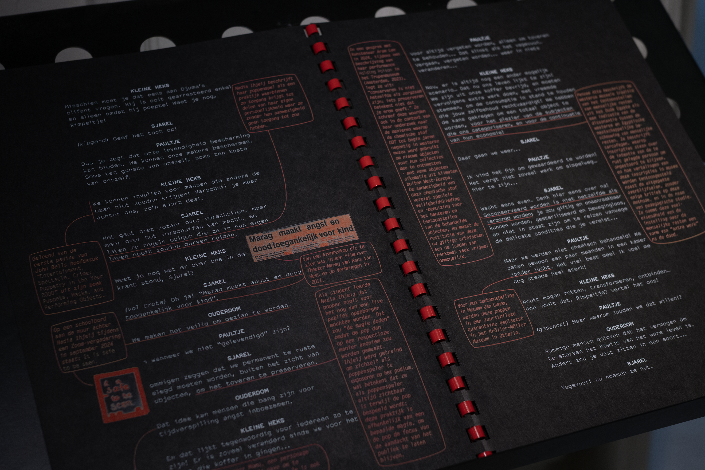 In the resulting work, the puppets are put in conversation with a Dutch script read aloud by unprofessional actors, with synchronized LED lights that illuminate their faces when they speak. In a neighboring display case, a "chorus" joins them in song intermittently throughout their conversation.