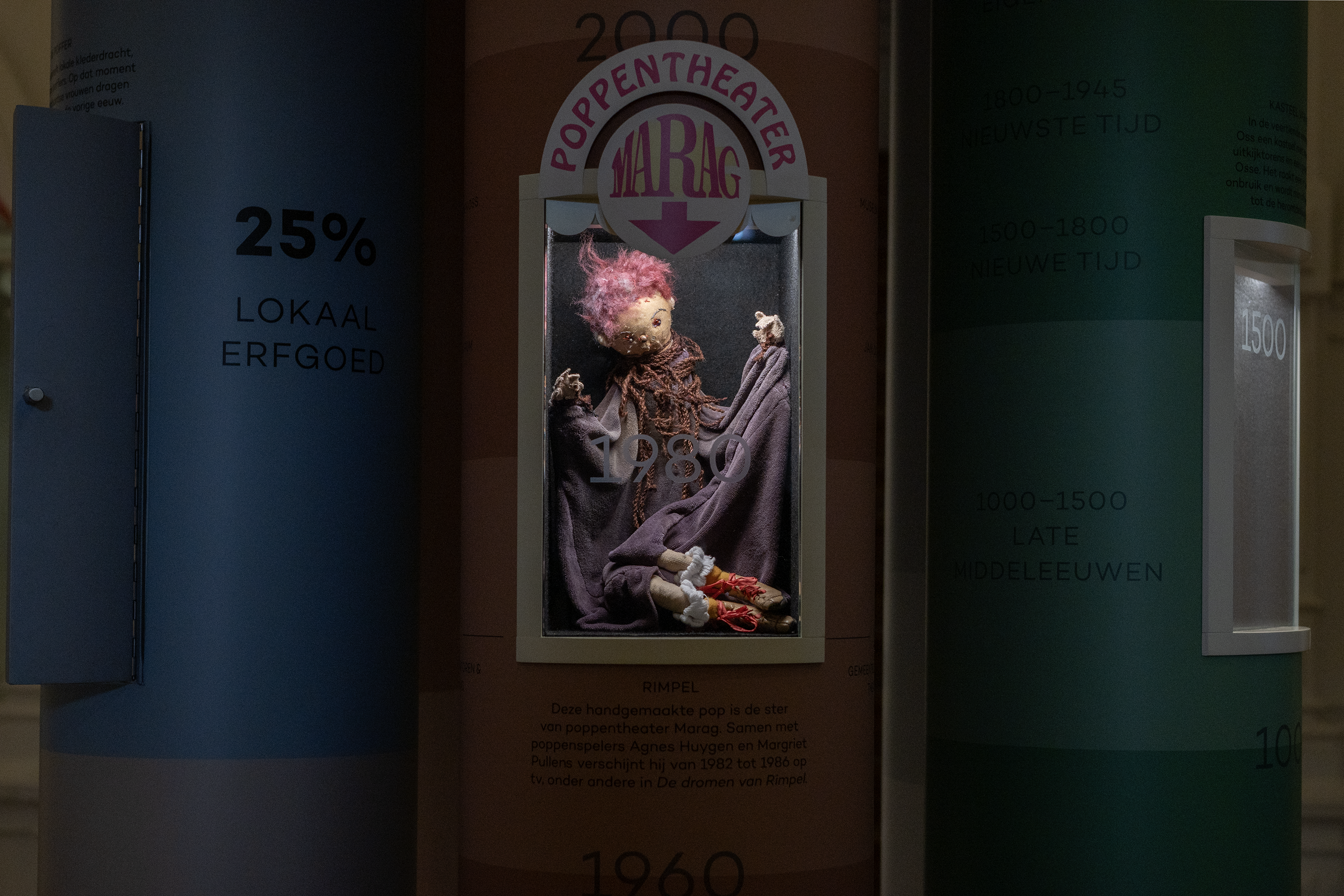 With the support of curator Merel van den Nieuwenhof, this work mounts existing puppets from the archive of Poppentheater Marag on display in the museum nearby Rimple. Their individual characters were researched independently and with the support of Evelien Pullens, puppeteer and daughter of Margriet.