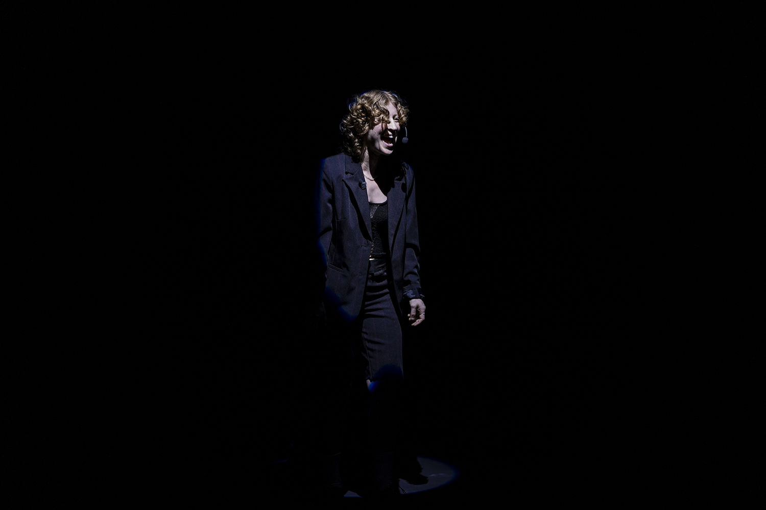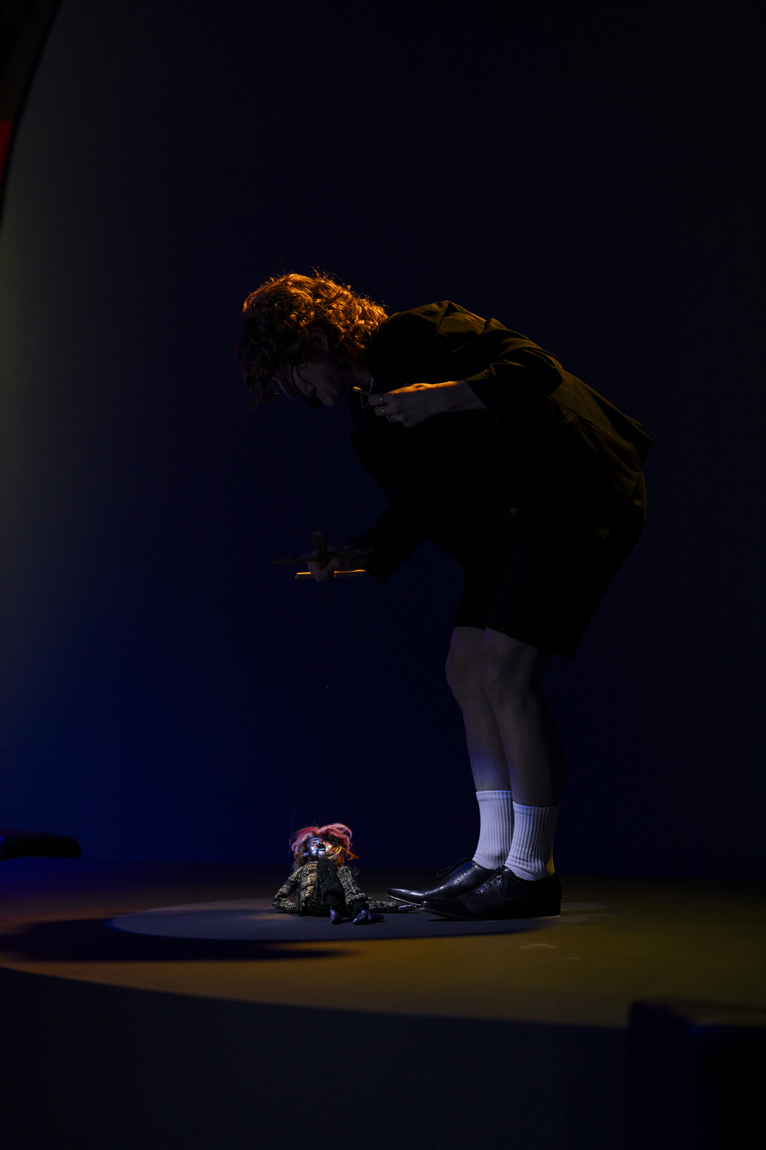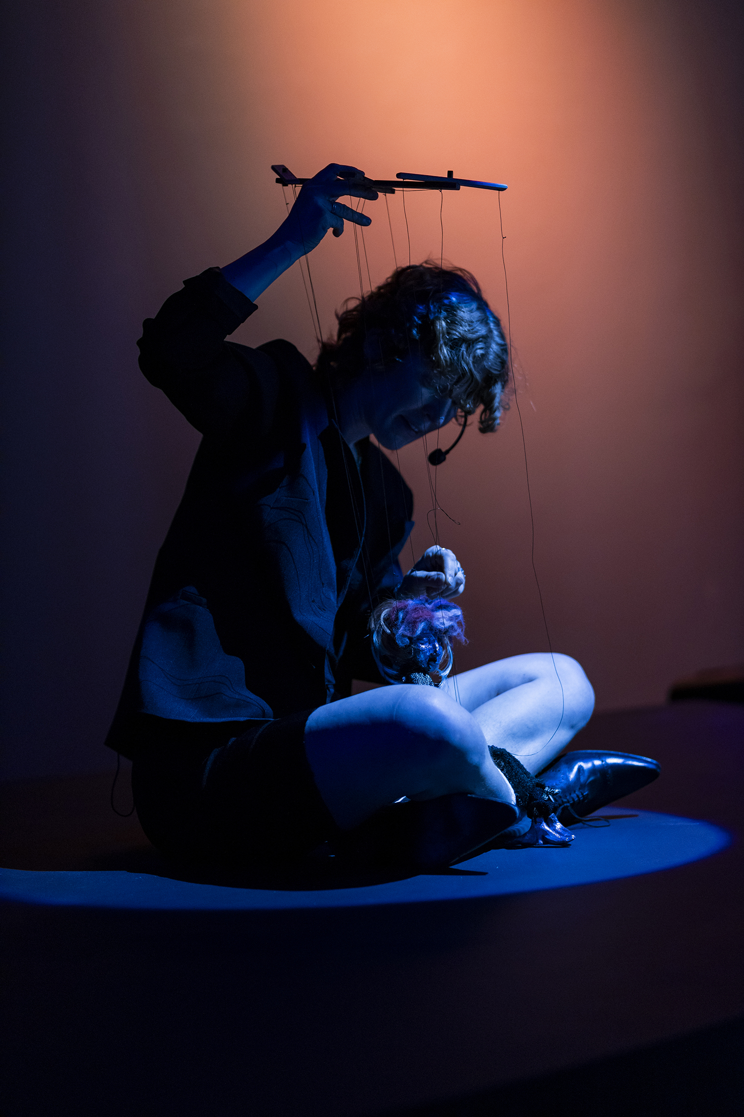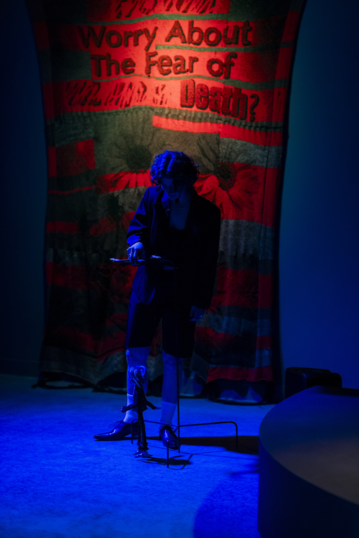 In the corner of a room that is lit with theater lights that fade in and out and move, a stage waits for live intervention. In four acts, a two-sided puppet serves as a messenger from a threshold between life and death, where they sit in perpetuity.