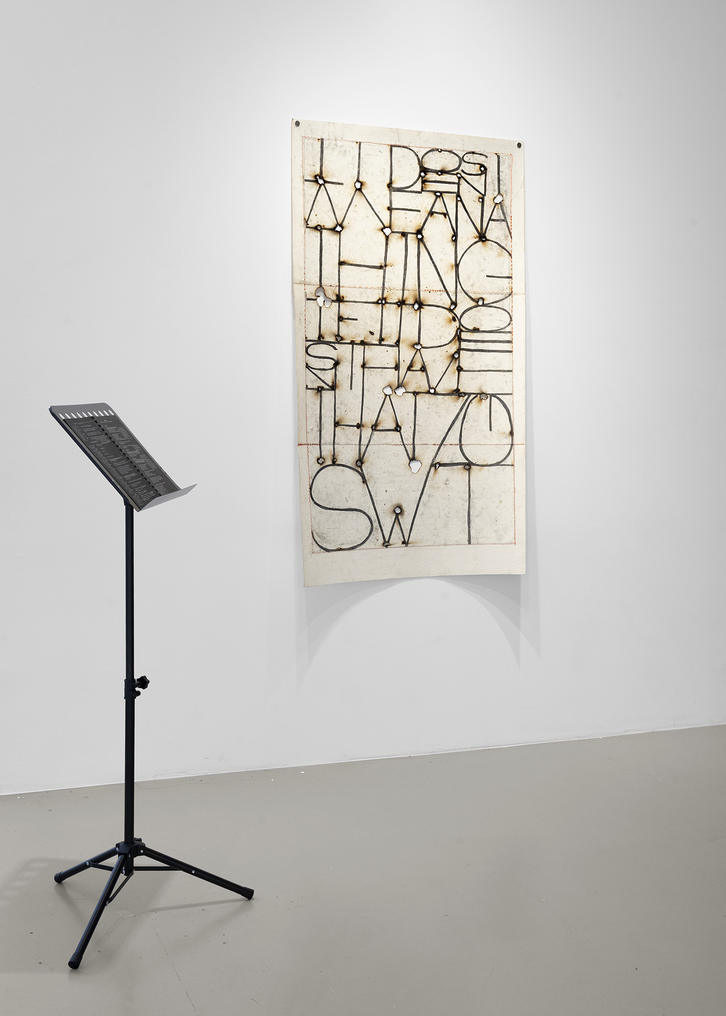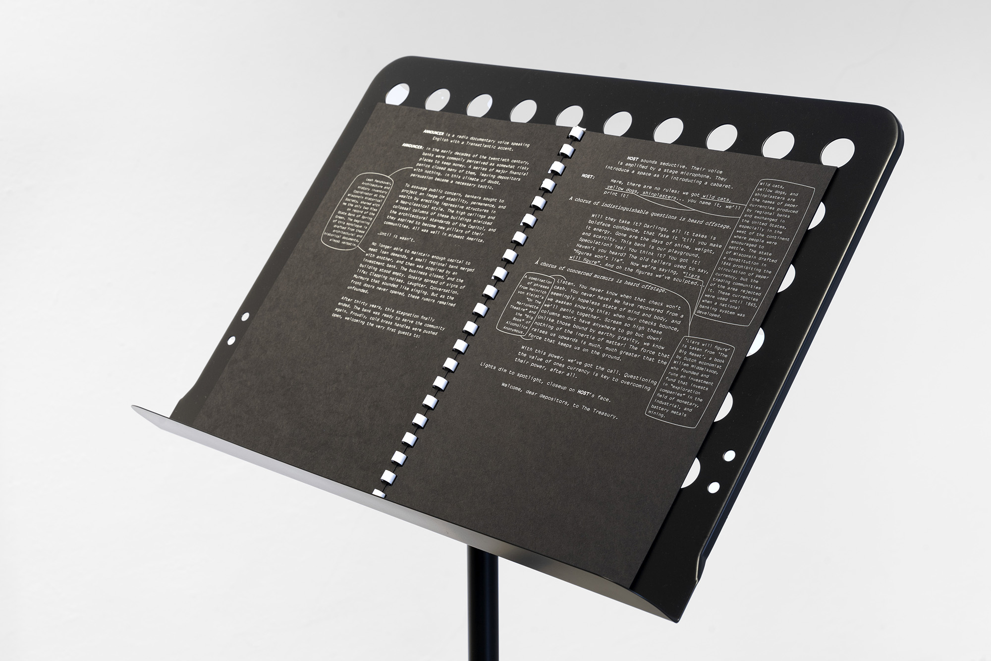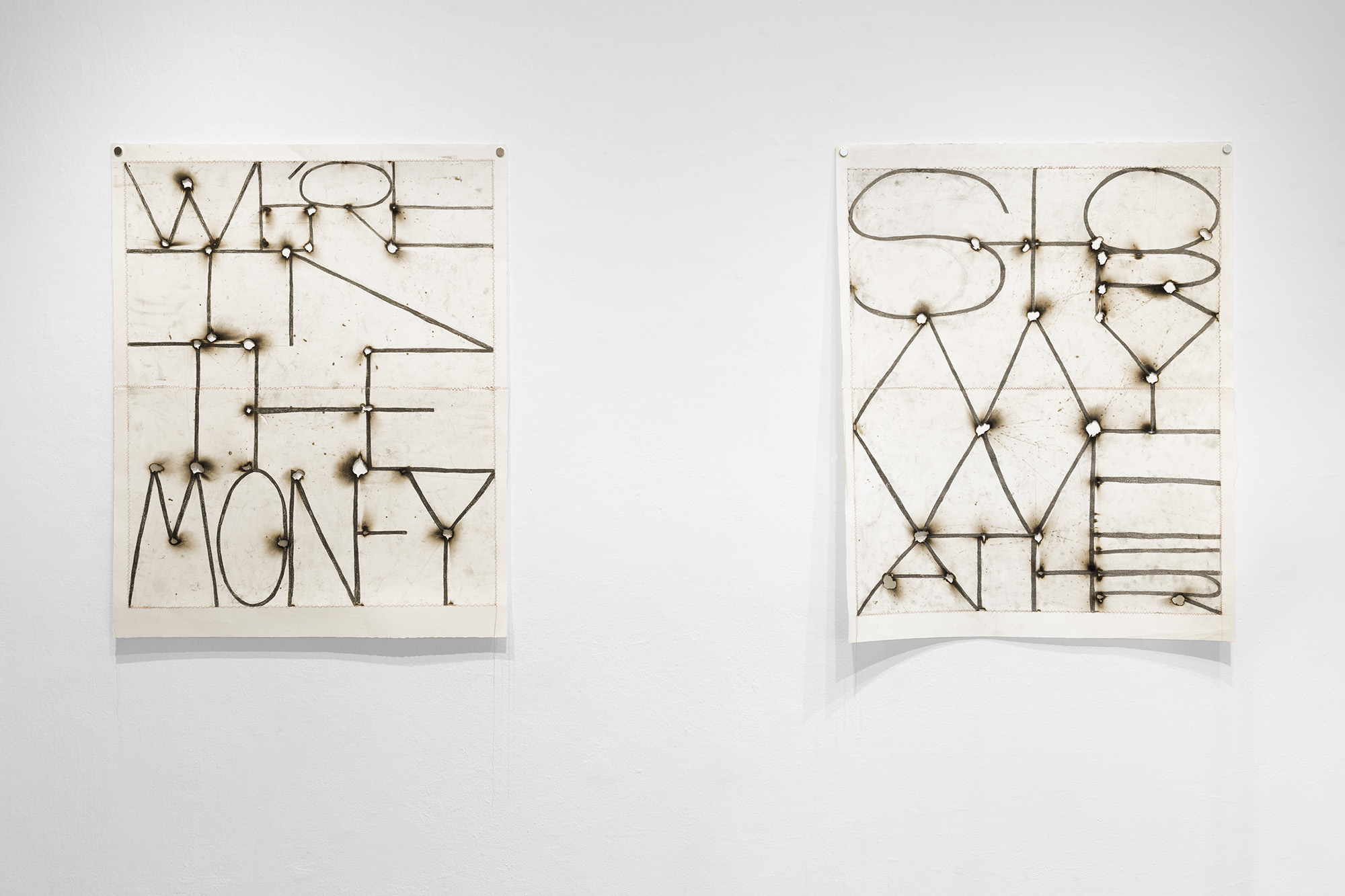 In this exhibition, The Treasury, a two-channel video, was exhibited alongside three drawings made with pencil and burn marks on found and sewn paper. The drawings write the titles of three songs: "We're In The Money", "Stormy Weather", and "It Doesn't Mean A Thing If It Doesn't Have That Swing". These three songs are played as background tracks on a segment of American National Public Radio (NPR)'s daily show Marketplace, where the stock market numbers are read aloud. What song is played is dependent on whether the numbers are up, down, or "swinging".