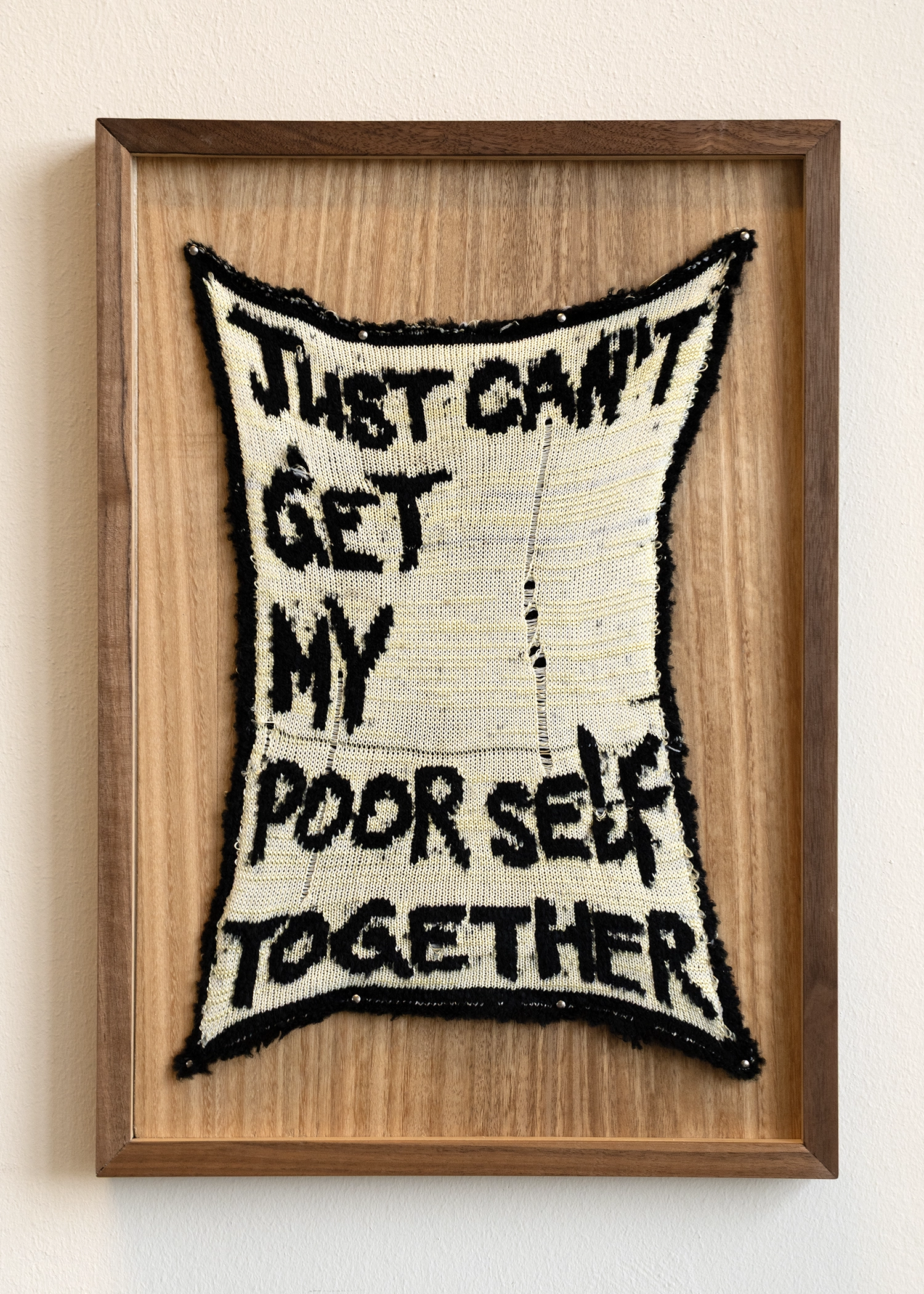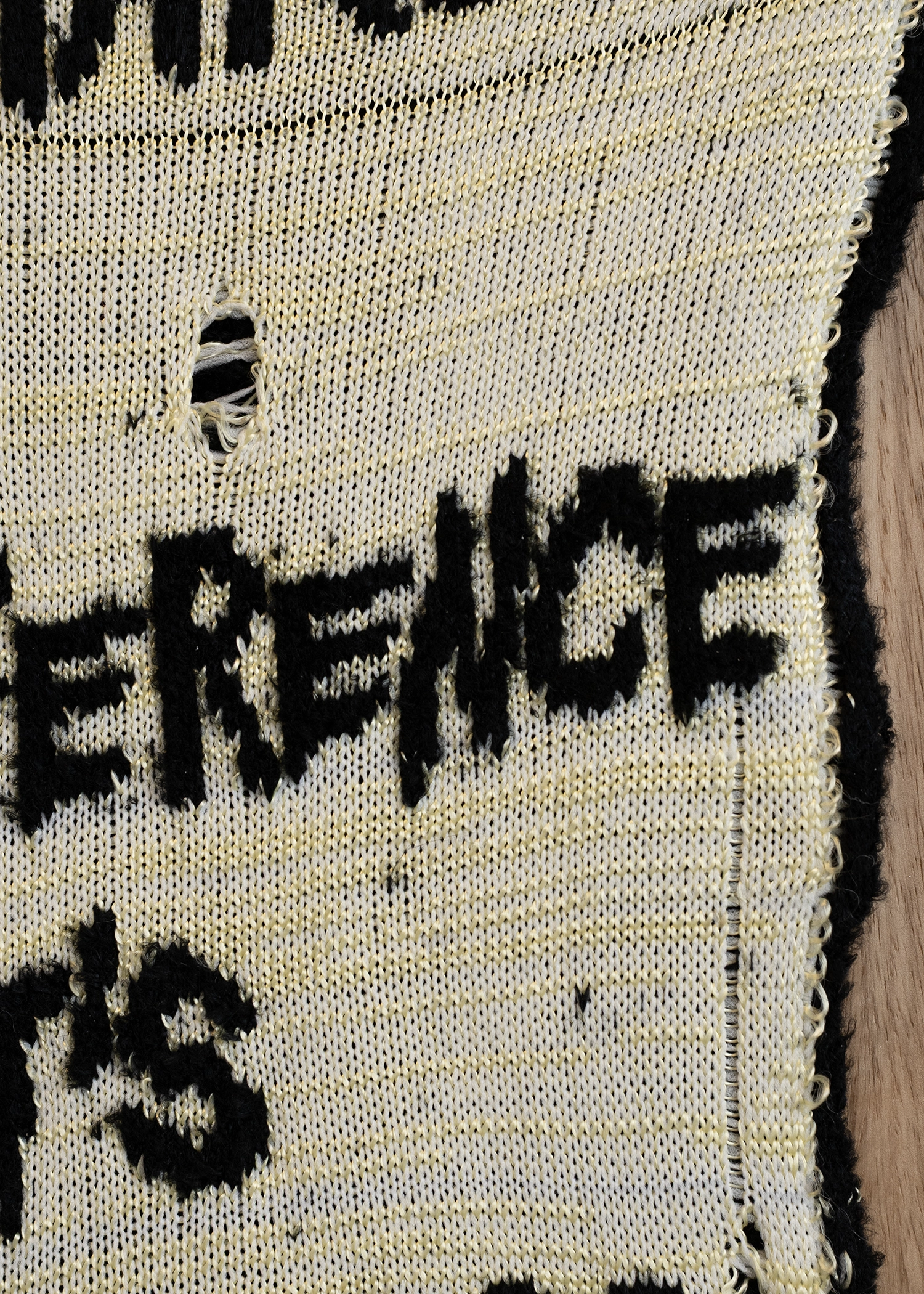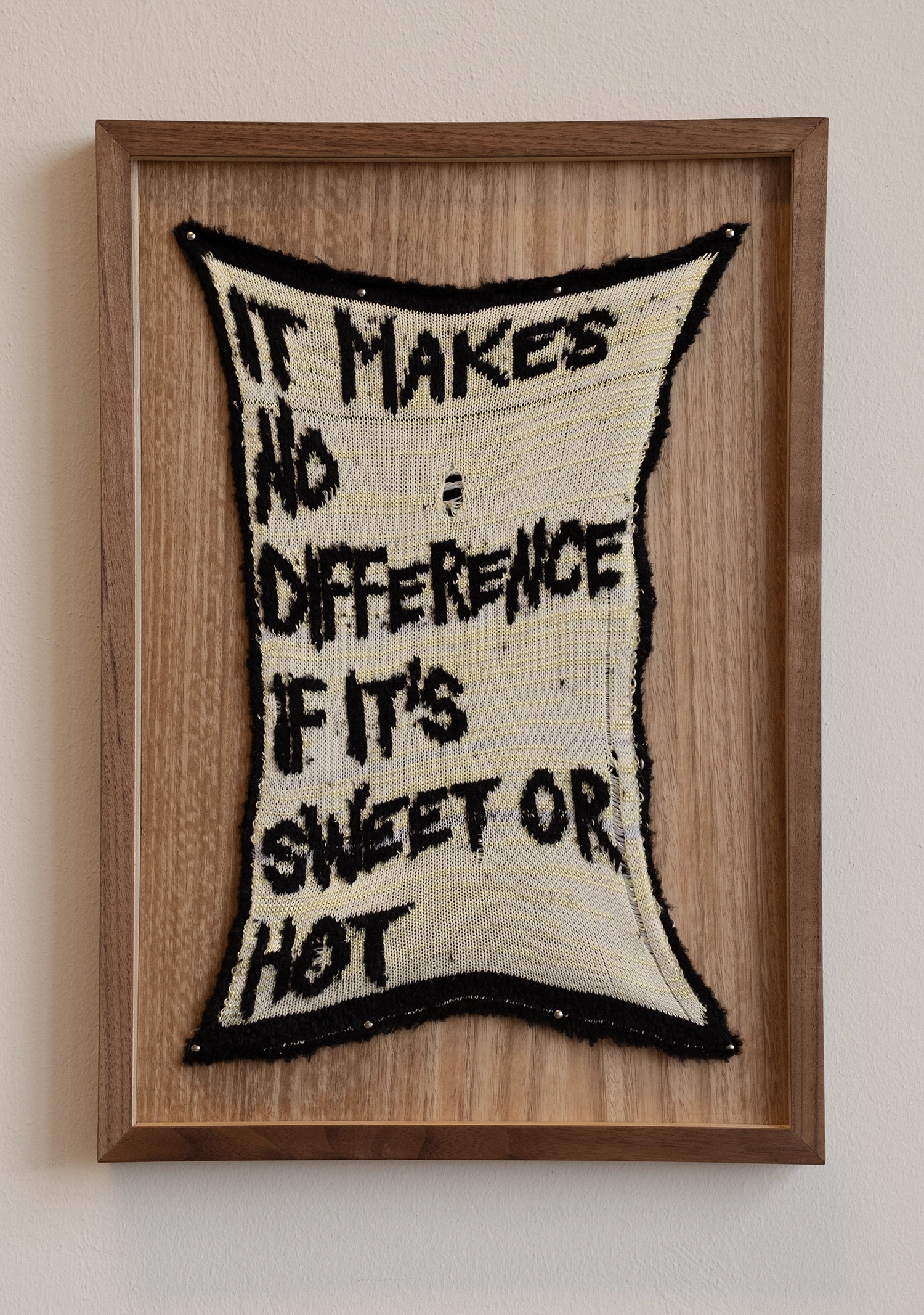 - Knitted words — in some places they seem quite frayed — tell us that it makes no difference whether it’s sweet or hot, the poor self or about the encounter with the landlord. What reads like comments taken from everyday life are in fact lines from song lyrics that accompany the stock market news on a US radio show. The choice of song—whether it is “We’re in