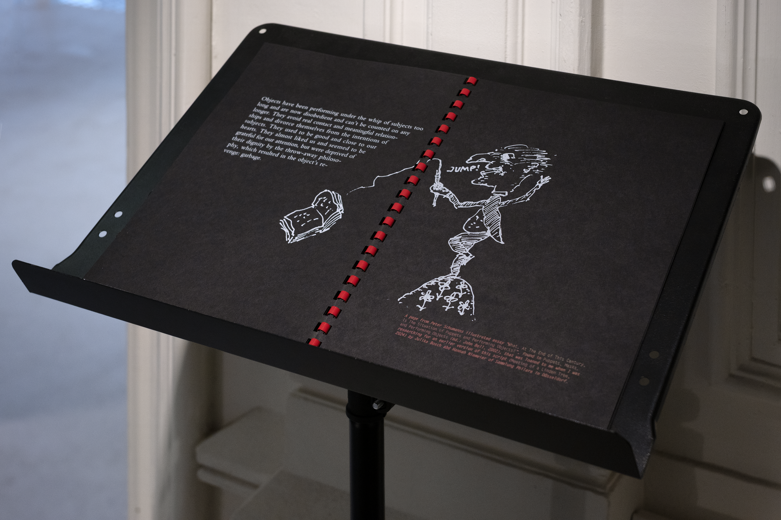 The script was developed based on Meeting of a Linden Tree / Ein Lindentreffen, a similar work from 2024. The writing was informed by a series of conversations with artists, puppeteers, and researchers Pansee Atta, Aram Lee, Ada M. Patterson, and Nadia Ihjeij. The conversations focused on their personal relationships with exhibiting their own performance costumes, objects, or puppets, and also their research on the traditions of exhibition in Western museological practice.